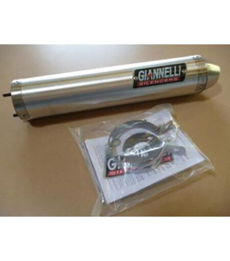 Silencieux d'échappement de marque GIANELLI finition aluminium. La fixation s'effectue par trois vis diamètre 6mm entre axe 40mm. Le silencieux mesure 70mm de diamètre et mesure environ 37cm de longueur hors tout. Vendu à l'unité. Livré conforme à la photo. ...
