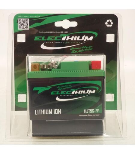 Batterie polymère Electhium neuve haut de gamme au Litium référence YTZ5S-BS / HJTZ5S-FP. Caractéristiques: - Longueur: 113mm - Largeur: 70mm - Hauteur: 85mm - Tension: 12.8V - Capacité: 1.6Ah - CCA: 140A - Bornes + à droite - Poids 500 grammes La batterie Lithium est dotée d'avantages non négligeables. 3 à 4 fois plus légère qu?une batterie classique, sa décharge est faible et sa durée de vie est doublée. Des performances au top avec un net gain de puissance lors des démarrages. De plus, la performance est constante tout au long de la phase de démarrage, ce qui rend plus aisé le démarrage d?un gros mono ou un bi-cylindre par exemple. Elle se recharge très rapidement (6mn). Ses performances sont très fiables, même à hautes températures. Sécurité renforcée car elle est non explosive et non combustible. Conforme aux normes ISO9001, ISO14001, CE, UL certification, ROHS. ...
