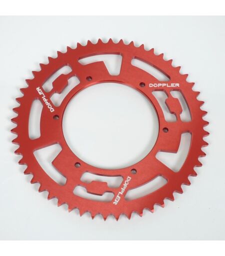Couronne de transmission neuve de marque Doppler en aluminium coloris rouge équipée de 53 dents au pas 420. Dimensions: - Diamètre intérieur: 108mm - Fixation par 6 trous diamètre 6mm - Entre axe des trous de fixation en diagonale: 123mm - Entre axe des trous de fixation cote à cote: 61mm - Pas de 420 - Nombre de dents de la couronne: 53 dents Vendue à l'unité. Livrée conforme à la photo. ...