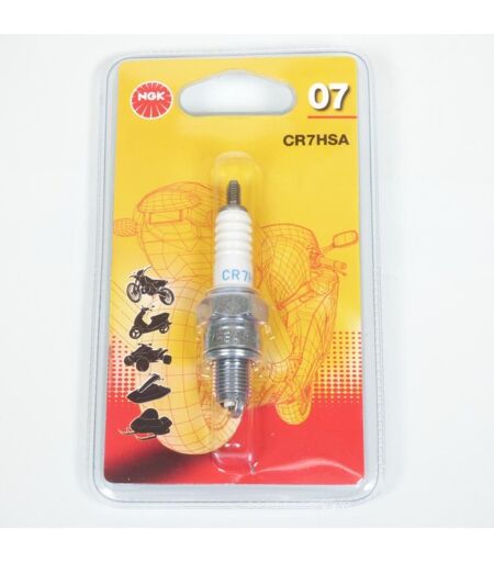 Bougie d'allumage NGK CR7HSA neuve vendue sous blister. Dimensions: - Culot diamètre: 10mm - Longueur filetée du culot: 12.7mm - Le démontage peut être effectué à l'aide d'une clé de 16mm. Cette bougie est équipée d'une électrode centrale en cuivre au design spécial SP améliorant le rendement moteur. Cette bougie est particulièrement adaptée aux moteurs quatre temps. Vendue à l'unité. Livrée conforme à la photo. ...
