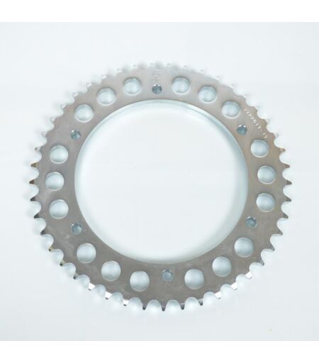 Couronne de transmission neuve en acier, 45 dents au pas 530, type 2011. Caractéristiques: - Nombre de dents: 45 - Pas de chaine: 530 - Type: 2011 - Diamètre intérieur: 155mm - Épaisseur: 9mm - Nombre de trous: 6 - Diamètre trous: 8.5mm - Entre axe des trous: 176mm Vendue à l'unité. Livrée conforme à la photo. ...