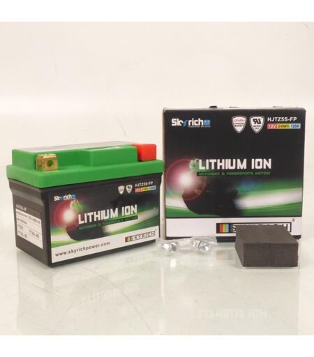 Batterie polymère Skyrich neuve haut de gamme au Litium référence YTZ5S-BS / HJTZ5S-FP. Caractéristiques: - Longueur: 113mm - Largeur: 70mm - Hauteur: 85mm - Tension: 12V - Capacité: 1.6Ah - CCA: 120A - Bornes + à droite Les batteries Lithium sont ultra légères et sans aucun entretien Elle conviennent parfaitement à tous les types de moto, quad, scooter et Jet-ski. Elles offres de nombreux avantages : 3 fois plus légère qu?une batterie classique au plomb, décharge faible et constante, recharge rapide en 6 minutes, durée de vie supérieure (le double par rapport à une batterie normale), performances parfaites mêmes à hautes températures et haute protection car non explosives et non combustibles. Conformes aux normes ISO9001, ISO14001, CE, UL certification et ROHS. La batterie lithium est la plus respectueuse pour l?environnement. Vendue à l'unité. Livrée conforme à la photo. ...