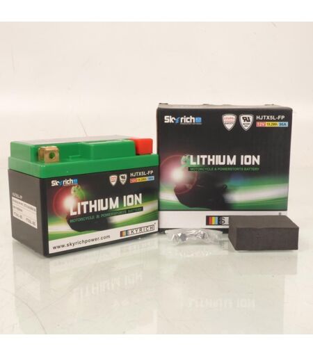 Batterie polymère Skyrich neuve haut de gamme au Litium référence YTX5L-B / HJTX5L-FP. Caractéristiques: - Longueur: 113mm - Largeur: 70mm - Hauteur: 85mm - Tension: 12V - Capacité: 1.6Ah - CCA: 96A - Bornes + à droite Les batteries Lithium sont ultra légères et sans aucun entretien. Elles conviennent parfaitement à tous les types de moto, quad, scooter et Jet-ski. Elles offres de nombreux avantages: 3 fois plus légère qu?une batterie classique au plomb, décharge faible et constante, recharge rapide en 6 minutes, durée de vie supérieure (le double par rapport à une batterie normale), performances parfaites mêmes à hautes températures et haute protection car non explosives et non combustibles. Conformes aux normes ISO9001, ISO14001, CE, UL certification et ROHS. La batterie lithium est la plus respectueuse pour l?environnement. Vendue à l'unité. Livrée conforme à la photo. ...