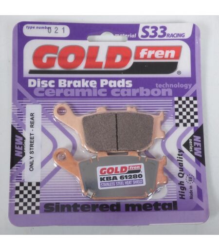 Plaquette de frein métal fritté GOLD Fren type 021 qualité S33 Racing neuve. Dimensions: - Longueur: 85.7mm - Largeur: 40mm - Épaisseur: 8.9mm Vendues par paire. Livrées conforme à la photo. ...