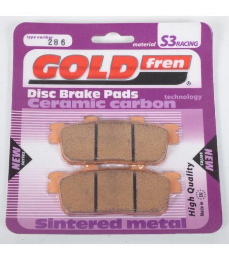Plaquette de frein métal fritté GOLD Fren type 286 qualité S3 neuve. Dimensions: - Longueur: 93.6mm - Largeur: 35.8mm - Épaisseur: 10.6mm Vendues par paire. Livrées conforme à la photo. ...