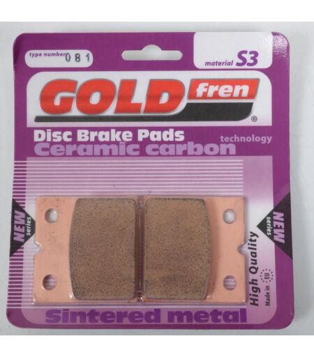 Plaquette de frein métal fritté GOLD Fren type 081 qualité S3 neuve. Dimensions: - Longueur: 55.6mm - Largeur: 53.6mm - Épaisseur: 9mm Vendues par paire. Livrées conforme à la photo. ...