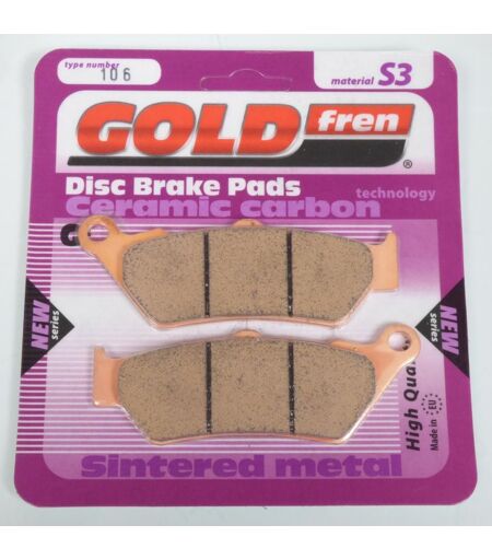 Paire plaquettes de frein métal fritté Gold Fren type 106 qualité S3 neuve. Vendues par paire. Livrées conforme à la photo. ...