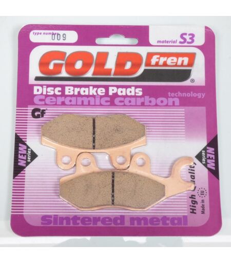 Paire plaquettes de frein métal fritté Gold Fren type 009 qualité S3 neuve. Dimensions : - Longueur 1 : 96.7mm. - Largeur 1 : 42mm. - Épaisseur 1 : 7.7mm. - Longueur 2 : 77.3mm. - Largeur 2 : 42mm. - Épaisseur 2 : 7.7mm. Vendues par paire. Livrées conforme à la photo. ...