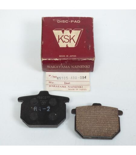 Paire plaquettes de frein neuve de marque KSK référence 45105-438-004 fabrication Japon. Dimensions: - Longueur: 67mm - Hauteur: 49.6mm - Épaisseur: 9mm Vendues par paire. Livrées conforme à la photo. ...