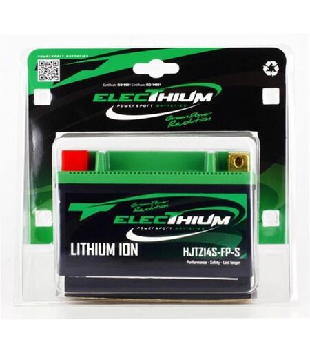 Batterie polymère Electhium neuve au Lithium référence HJTZ14S-FP-S. Équivalence pour batteries moto YTZ14S-BS et YTZ12S-BS. Caractéristiques : - Longueur : 150mm. - Largeur : 85mm. - Hauteur : 90mm. - Voltage : 12.8V. - Capacité : 4.5Ah - CCA : 350A. - Borne + à gauche. La batterie Lithium est dotée d'avantages non négligeables : - 3 à 4 fois plus légère qu?une batterie classique. - Décharge faible. - Durée de vie doublée. - Net gain de puissance lors du démarrage du moteur. De plus, la performance est constante tout au long de la phase de démarrage, ce qui rend plus aisé la mise en route d?un gros mono ou un bi-cylindre par exemple. Moteur tournant, la batterie se recharge très rapidement (6mn). Ses performances sont très fiables, même à hautes températures. Sécurité renforcée car non explosive et non combustible. Conforme aux normes ISO9001, ISO14001, ...