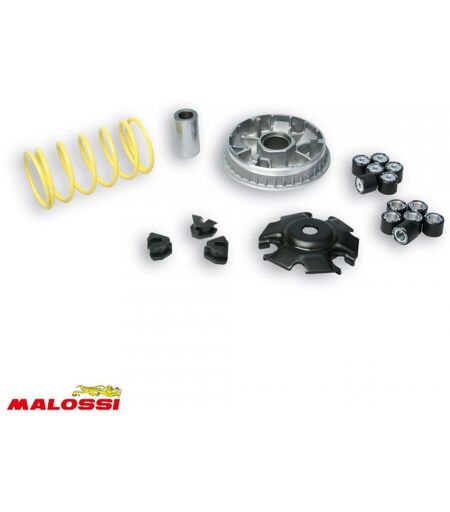 Variateur maxi scooter neuf de marque Malossi, modèle Multivar 2000. Le kit Multivar 2000 comprend : - Une joue mobile de variateur - Un plateau d'appui avec ses trois guides - Six galets 8g dimensions 20x17mm - Six galets 10.5g dimensions 20x17mm - Un canon de variateur dimensions 16x27x49.5mm - Un ressort de poussée jaune 4.5k dimensions 63.1x120mm (diamètre du fil 4.6mm). Le variateur Malossi Multivar 2000 offre un fonctionnement doux et progressif, ainsi qu'un rendement élevé à la transmission de votre scooter. Tout ce qui est fourni est visible sur la photo. Vendu à l'unité. Livré conforme à la photo. ...