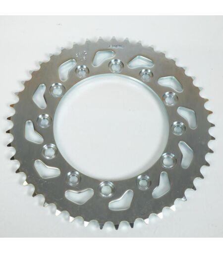 Couronne de transmission arrière neuve en acier de coloris gris marque SUNSTAR. Dimensions: - Nombre de dents: 45 dents - Pas de 520 - Alésage (diamètre intérieur): 130mm - Nombre de trous de fixation: 6 dans chaque diamètre - Diamètre des trous de fixation: 8.5 ou 10.5mm selon les trous choisis - Entre axe des trous de fixation: 150mm - Épaisseur au niveau des dents: 5.8mm - Déport: 0mm Vendue à l'unité. Livrée conforme à la photo. ...