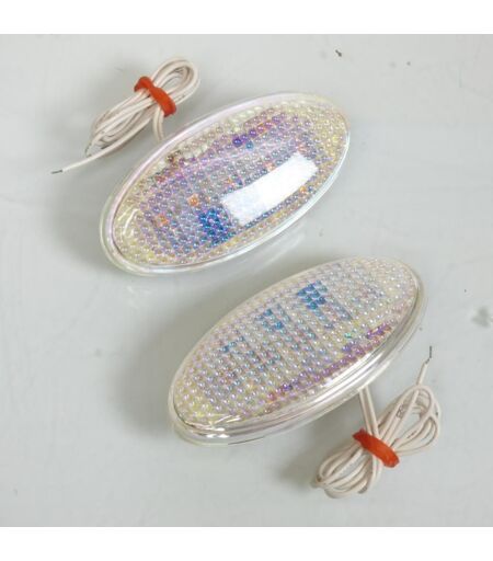 Paire de clignotant ¿il de chat à LED neuf de marque DG équipé d'un cabochon iridium. Caractéristiques: - Tension: 12V - Couleur cabochon: iridium - Couleur éclairage: orange - Longueur: 72mm - Largeur: 36mm - Épaisseur hors fixation: 12mm - Fixation autocollante et par deux clips plastiques diamètre 5mm entre axe 38mm - Produit décoratif non homologué - Clignote automatiquement sans centrale Vendus par paire. Livrés conforme à la photo. ...