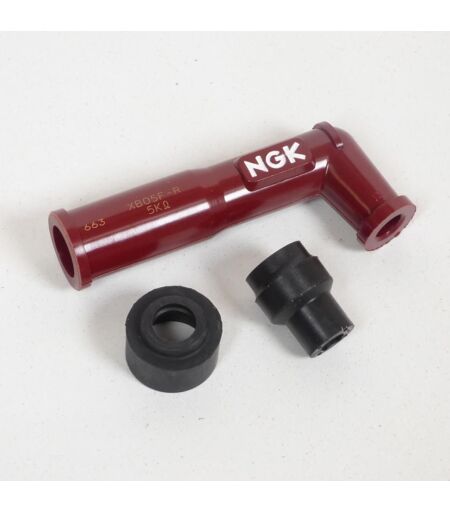 Capuchon antiparasite NGK XB05F-R coudé 120° neuf coloris bordeaux. Cet antiparasite doit être utilisé pour une bougie sans douille. Dimensions: - Diamètre extérieur: 23mm - Longueur: 90mm - Résistance: 5Kohm Vendu à l'unité. Livré conforme à la photo. ...
