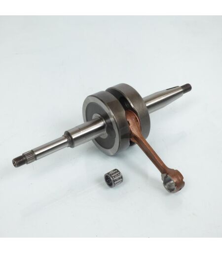 Vilebrequin d'embiellage neuf adaptable avec sa cage à aiguille de piston (12x16x13mm). Prévu pour scooter Peugeot 50cc 2 temps sans pompe à air. Dimensions: - Diamètre intérieur du pied de bielle au niveau de l'axe de piston: 16mm - Largeur du pied de bielle au niveau de l'axe de piston: 12mm - Diamètre des masses de vilebrequin: 69.6mm - Largeur au niveau des masses de vilebrequin: 43mm - Diamètre des soies de vilebrequin au niveau des portées de roulement: 20mm - Filetage M10 Pas 1.25 standard (non inversé) coté variateur - Filetage M10 Pas 1.25 standard (non inversé) coté allumage - Longueur totale du vilebrequin: 236mm Vendu à l'unité. Livré conforme à la photo. ...