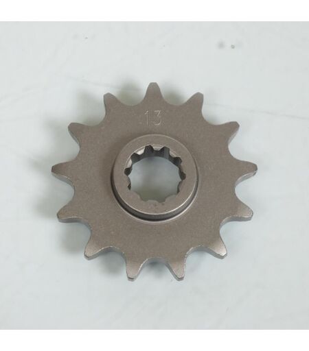 Pignon de sortie de boîte 13 dents en acier neuf de marque SIFAM. Caractéristiques: - Nombre de dents: 13 dents - Pas: 420 - Diamètre intérieur cannelure: 14mm - Diamètre extérieur cannelures: 17mm - Nombre de cannelures: 10 - Épaisseur au niveau de la chaine: 5.8mm - Épaisseur au niveau des cannelures: 12mm - Déport: Oui - Trou pour le capteur de vitesse: Non Vendu à l'unité. Livré conforme à la photo. ...