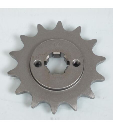 Pignon de sortie de boîte 14 dents en acier neuf de marque SIFAM. Caractéristiques: - Nombre de dents: 14 dents - Pas: 520 - Diamètre intérieur cannelure: 16mm - Diamètre extérieur cannelures: 20mm - Nombre de cannelure: 6 - Largeur cannelure: 4mm - Fixation par deux trous M6 entre axe 30mm - Épaisseur au niveau de la chaine: 5.8mm - Épaisseur au niveau des cannelures: 10mm - Déport: Oui - Trou pour le capteur de vitesse: Non Vendu à l'unité. Livré conforme à la photo. ...