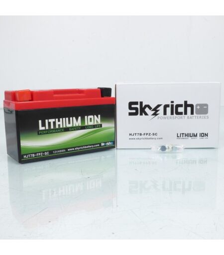 Batterie polymère Skyrich neuve haut de gamme au Litium référence YT7B-BS / HJT7B-FPZ-SC. Caractéristiques: - Longueur: 150mm - Largeur: 65mm - Hauteur: 92mm - Tension: 12V - Capacité: 8Ah - CCA: 190A - Bornes + à gauche La batterie Skyrich YT7B-BS est la batterie identique à la première monte choisi par DUCATI pour équiper ses hyper sportives, développée spécifiquement entre autre pour le Superleggera. Ultra légère, puissance optimisée et capot de batterie rouge, la batterie skyrich YT7B-BS et la batterie de remplacement idéale et spécifique à l'origine à Ducati. De plus, les batteries Lithium sont ultra légères et sans aucun entretien Elle conviennent parfaitement à tous les types de moto, quad, scooter et Jet-ski. Elles offres de nombreux avantages : 3 fois plus légère qu?une batterie classique au plomb, décharge faible et constante, recharge rapide en 6 minutes, durée de vie supérieure (le double par rapport ...