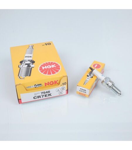 Boîte de 10 bougies d'allumage NGK CR7EK neuves. Dimensions : - Culot diamètre 10mm. - Longueur filetée du culot : 19mm. - Le démontage peut être effectué à l'aide d'une clé de 16mm. Les électrodes sont préréglées à un écartement de 0.7mm. Cette bougie est particulièrement adaptée aux moteurs quatre temps. Vendues par boîte de 10. Livrée conforme à la photo. ...