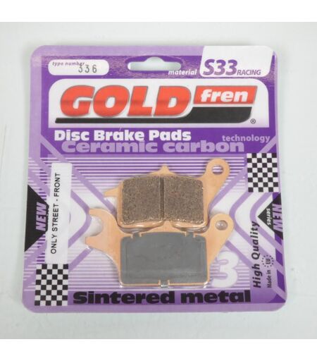 Paire plaquettes de frein métal fritté Gold Fren type 336 qualité S33 neuve. Vendues par paire. Livrées conforme à la photo. ...