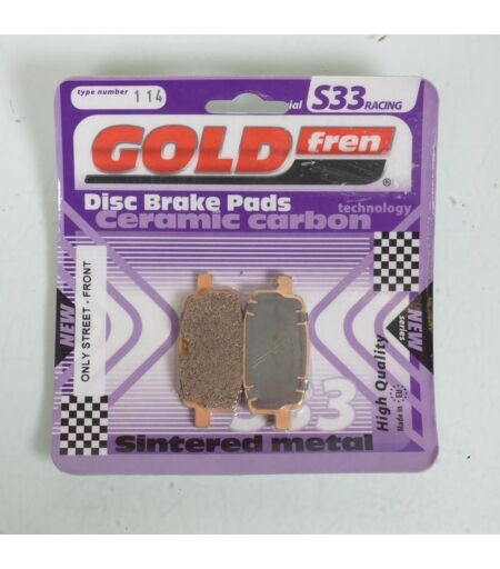 Paire plaquettes de frein métal fritté Gold Fren type 114 qualité S33 neuve. Dimensions : - Longueur : 60.6mm - Hauteur : 26mm - Épaisseur : 7.3mm Vendues par paire. Livrées conforme à la photo. ...