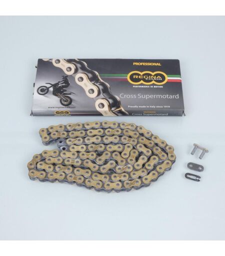 Chaîne de transmission hyper renforcée neuve de marque Regina, pas 520, 108 maillons, sans joints toriques. Vendue avec une attache rapide. Livrée conforme à la photo. ...