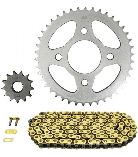 Kit chaine de transmission complet neuf de marque Afam (démultiplication origine). Ce kit chaine comprend: - Une couronne en acier 42 dents, alésage 58mm, 4 trous Ø810.5mm entre axe 90mm - Un pignon de 13 dents - Une chaine renforcée coloris or 118 maillons au pas 428 avec attache rapide Vendu à l'unité. Livré conforme à la photo. ...