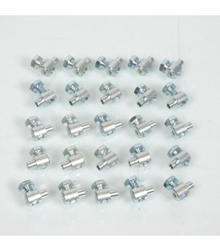 Boite de 25 serre-câble neuf prévu pour décompresseur cyclo ou frein vélo. - Prévu pour câble diamètre 3mm maximum - Diamètre du serre câble est de 7mm au plus grand et 4mm plus petit - Longueur totale de 10.5mm - Le serrage se fait à l'aide d'une clé de 7 Vendu par 25. Livré conforme à la photo. ...