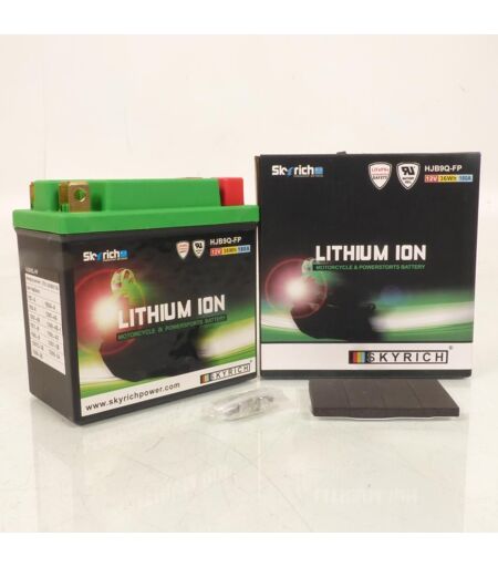 Batterie polymère Skyrich neuve haut de gamme au Litium référence 12N9-4B-1 / HJB9Q-FP. Caractéristiques: - Longueur: 134mm - Largeur: 75mm - Hauteur: 133mm - Tension: 12V - Capacité: 3Ah - CCA: 180A - Bornes + à gauche ou à droite Les batteries Lithium sont ultra légères et sans aucun entretien Elle conviennent parfaitement à tous les types de moto, quad, scooter et Jet-ski. Elles offres de nombreux avantages : 3 fois plus légère qu?une batterie classique au plomb, décharge faible et constante, recharge rapide en 6 minutes, durée de vie supérieure (le double par rapport à une batterie normale), performances parfaites mêmes à hautes températures et haute protection car non explosives et non combustibles. Conformes aux normes ISO9001, ISO14001, CE, UL certification et ROHS. La batterie lithium est la plus respectueuse pour l?environnement. Vendue à l'unité. Livrée conforme à la photo. ...