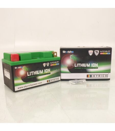 Batterie polymère Skyrich neuve haut de gamme au Litium référence YTZ10S / HJTZ10S-FP. Caractéristiques: - Longueur: 150mm - Largeur: 87mm - Hauteur: 93mm - Tension: 12V - Capacité: 8.6Ah / 48Wh - CCA: 240A - Bornes + à gauche Les batteries Lithium sont ultra légères et sans aucun entretien Elle conviennent parfaitement à tous les types de moto, quad, scooter et Jet-ski. Elles offres de nombreux avantages : 3 fois plus légère qu?une batterie classique au plomb, décharge faible et constante, recharge rapide en 6 minutes, durée de vie supérieure (le double par rapport à une batterie normale), performances parfaites mêmes à hautes températures et haute protection car non explosives et non combustibles. Conformes aux normes ISO9001, ISO14001, CE, UL certification et ROHS. La batterie lithium est la plus respectueuse pour l?environnement. Vendue à l'unité. Livrée conforme à la photo. ...