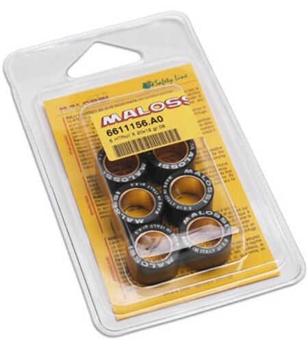 Kit galets rouleaux de variateur neuf de marque Malossi. Caractéristiques : - Diamètre extérieur : 20mm. - Largeur : 12mm. - Poids : 8 grammes. - Coloris : noir. Vendus par 6 unités. Livré conforme à la photo. ...