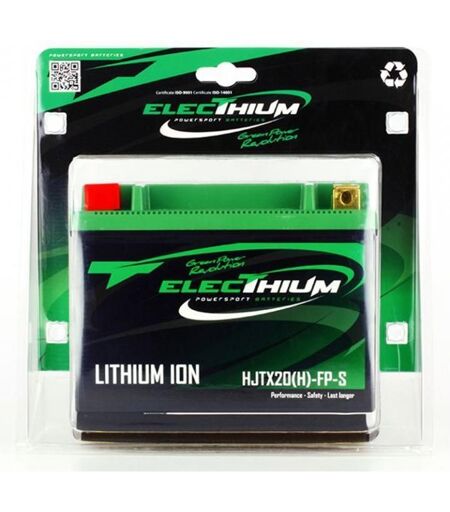 Batterie polymère Electhium neuve au Lithium référence HJTX20(H)-FP-S. Équivalence pour batteries moto GYZ20H, YTX20H-BS, YTX20-BS, YB16-B-CX, YB16-B, YB16C-B, YB18-A, Y50-N18A-A et HVT5. Caractéristiques : - Longueur : 175mm. - Largeur : 85mm. - Hauteur : 130mm. - Voltage : 12.8V. - Capacité : 7Ah - CCA : 420A. - Borne + à gauche. La batterie Lithium est dotée d'avantages non négligeables : - 3 à 4 fois plus légère qu?une batterie classique. - Décharge faible. - Durée de vie doublée. - Net gain de puissance lors du démarrage du moteur. De plus, la performance est constante tout au long de la phase de démarrage, ce qui rend plus aisé la mise en route d?un gros mono ou un bi-cylindre par exemple. Moteur tournant, la batterie se recharge très rapidement (6mn). Ses performances sont très fiables, même à hautes températures. Sécurité renforcée car non explosive et non ...