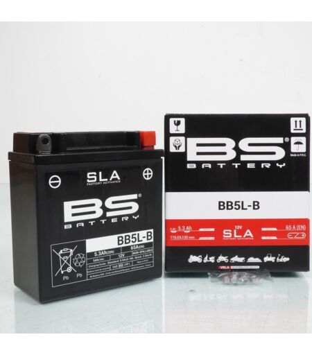 Batterie BS Battery neuve sans entretien activée usine vendue avec acide référence YB5L-B type SLA. Caractéristiques: - Longueur: 119mm - Largeur: 59mm - Hauteur: 130mm - Tension: 12V - Capacité: 5.3Ah - CCA: 65A - Bornes + à droite Les batteries BS sont une alternative fiable en vue d?un remplacement. Elles répondent aux normes électriques en vigueur et aux préconisations des constructeurs. Avantages: - Activée usine, pré-chargée, prête à l?emploi. - Cycle de vie supérieur (plus de 3 fois une batterie conventionnelle). - Facilité d?installation (aucun risque de déversement d?acide). - Haute puissance. - Aucun entretien. - Sans danger (pas de transport d?acide). - Montage multi-position (vertical ou horizontal). - Scellée, pas d?émission de gaz et de risque de déversement d?acide. - Préconisée pour les conditions climatiques froides. Vendue à l unité. ...