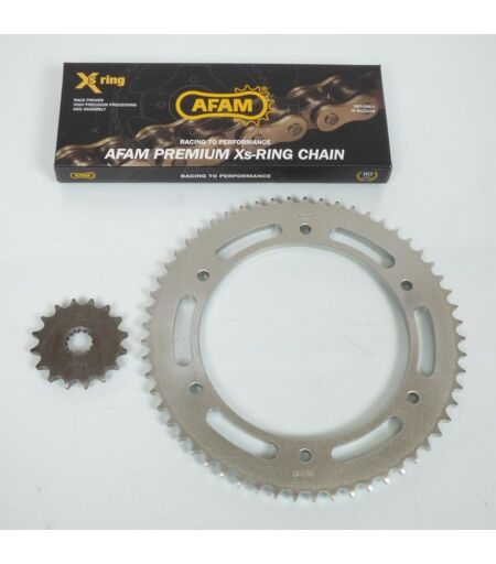 Kit chaîne de transmission complet neuf de marque Afam (démultiplication origine). Ce kit chaîne comprend : - Une couronne en acier de 57 dents, alésage 152mm, 6 trous Ø8.5mm entre axe 175mm. - Un pignon de 16 dents. - Une chaîne coloris or A428XMR-G à joints toriques plat 134 maillons au pas 428 avec attache rapide. Vendu à l'unité. Livré conforme à la photo. ...