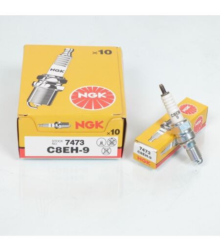 Boite de 10 bougies d'allumage NGK C8EH-9 neuves. Dimensions: - Culot diamètre: 10mm - Longueur du culot: 19mm - Longueur filetée du culot: 12.7mm Le démontage peut être effectué à l'aide d'une clé de 16mm. L'électrode est préréglée à un écartement de 0,9mm. Cette bougie est particulièrement adaptée aux moteurs quatre temps. Vendue par 10. Livrée conforme à la photo. ...