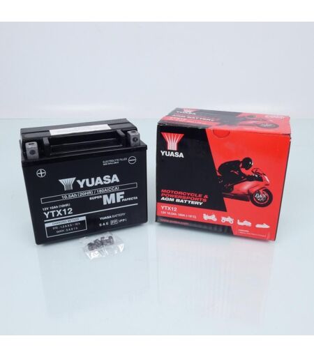 Batterie Yuasa au plomb type SLA AGM VRLA neuve sans entretien vendue prête à l'emploi référence YTX12. Caractéristiques : - Longueur : 150mm. - Largeur : 87mm. - Hauteur : 130mm. - Tension : 12V. - Capacité : 10.5Ah. - CCA : 180A. - Borne + à gauche. - Volume Acide: 0.6L. La batterie YUASA est très souvent utilisée en monte d'origine par les constructeurs. Elle est reconnue pour sa qualité et sa durée de vie exceptionnelle. Choisir Yuasa, c'est opter pour la tranquillité. Cette batterie sans entretien est livrée « prête à l?emploi », activée et chargée en usine (SLA). Aucune manipulation dangereuse n'est à effectuer. Technologie AGM «Absorbed Glass Mat» : l?électrolyte se trouvant dans la batterie étanche est absorbé ou stabilisé à l?intérieur par des buvards en fibre de verre. La batterie pourra être placée en position inclinée. Vendue à l'unité. Livrée conforme à la photo. ...