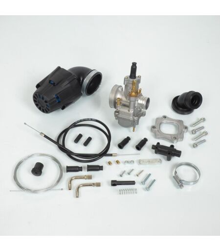 Kit carburateur de 21 neuf de marque Polini modèle CP 21 avec pipe d'admission (360°), cornet (coudé 90°), un kit câble et starter à câble ou manuel à tirette. Caractéristiques carburateur : - Montage : Souple - Dépression : Oui - Graissage : Oui - Starter : Manuel à tirette ou à câble - Diamètre extérieur coté admission : 24mm - Diamètre extérieur coté boite à air : 46mm - Longueur du carburateur entre boite à air et pipe d'admission : 71mm - Boisseau : D24-30 (Ø24mm x H30mm) - Aiguille : CP 14 22 - Gicleur principal : 100 - Puit : 35-12 - Gicleur ralenti : 40 Caractéristiques gicleur : Principal (type KEA) : - Taille : 100 - Filetage : M5 - Tête hexagonal six pans : 6mm - Longueur totale : 16.5mm Ralenti : - Taille : 40 - Filetage : M5 - Tête : Ø4mm (tournevis plat) - Longueur totale : 21.1mm Vendu avec : - Une pipe ...