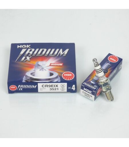 Boîte de 4 bougies d'allumage NGK CR9EIX Iridium IX neuve. Caractéristiques : - Type de bougie : Iridium IX - Type de connexion : Olive (amovible) - Culot diamètre : 10mm - Longueur filetée du culot : 19mm - Hexagonal : 16mm Cette bougie est équipée d'une électrode centrale en Iridium améliorant le rendement moteur. Cette bougie est particulièrement adaptée aux moteurs quatre temps. Vendues par boîte de 4. Livrées conforme à la photo. ...
