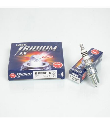 Boîte de 4 bougies d'allumage NGK BPR6EIX Iridium IX neuve. Caractéristiques : - Type de bougie : Iridium IX - Type de connexion : Olive (amovible) - Culot diamètre : 14mm - Longueur filetée du culot : 19mm - Hexagonal : 21mm Cette bougie est équipée d'une électrode centrale en Iridium améliorant le rendement moteur. Vendues par boîte de 4. Livrées conforme à la photo. ...