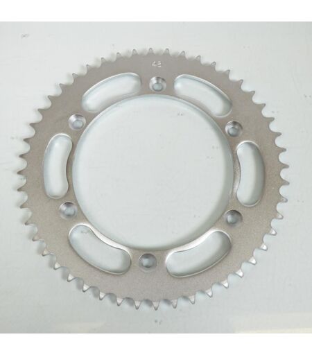 Couronne de transmission arrière neuve en acier de coloris gris marque sifam. Dimensions: - Nombre de dents: 48 dents - Pas de 520 - Alésage (diamètre intérieur): 148mm - Nombre de trous de fixation: 6 - Diamètre des trous de fixation: 8.5mm - Entre axe des trous de fixation: 170mm - Épaisseur au niveau des dents: 6mm - Déport: 0mm Vendue à l'unité sans la visserie. Livrée conforme à la photo. ...