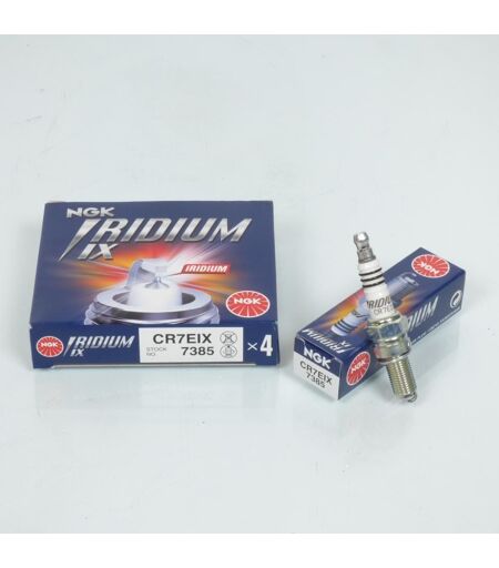 Boîte de 4 bougies d'allumage NGK CR7EIX Iridium IX neuve. Caractéristiques : - Type de bougie : Iridium IX - Type de connexion : Olive (amovible) - Culot diamètre : 10mm - Longueur filetée du culot : 19mm - Hexagonal : 16mm Cette bougie est particulièrement adaptée aux moteurs quatre temps. Vendues par boîte de 4. Livrées conforme à la photo. ...