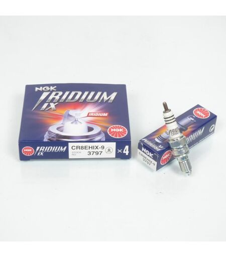 Boîte de 4 bougies d'allumage NGK CR8EHIX-9 Iridium IX neuve. Caractéristiques : - Type de bougie : Iridium IX - Type de connexion : Embout fileté (sans olive) - Culot diamètre : 10mm - Longueur filetée du culot : 19mm - Hexagonal : 16mm Cette bougie est équipée d'une électrode centrale en Iridium améliorant le rendement moteur. L'électrode est préréglée à un écartement de 0,9mm. Cette bougie est particulièrement adaptée aux moteurs quatre temps. Vendues par boîte de 4. Livrées conforme à la photo. ...