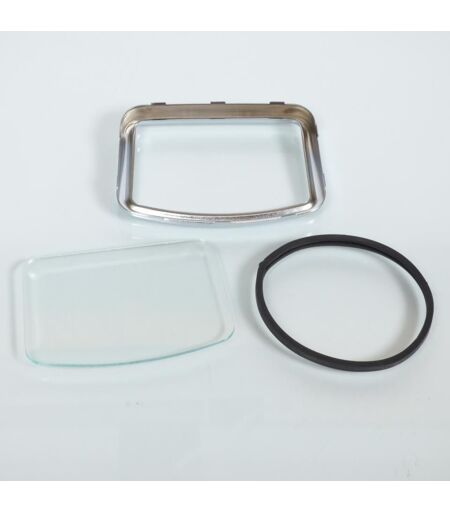 Kit vitre transparente (avec joint) et entourage de compteur chromé neuf de forme rectangulaire. - Largeur 78/82mm - Hauteur totale 55mm - Épaisseur 5/10mm Prévu pour cyclomoteur MBK, Motoconfort et Motobécane équipé de compteur type Transval, Thiret,... livré conforme à la photo. ...