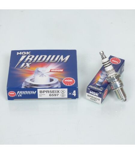 Boîte de 4 bougies d'allumage NGK BPR5EIX Iridium IX neuve. Caractéristiques : - Type de bougie : Iridium IX - Type de connexion : Olive (amovible) - Culot diamètre : 14mm - Longueur filetée du culot : 19mm - Hexagonal : 21mm Les bougies Iridium IX possèdent une électrode centrale très fine en iridium ainsi qu?une électrode de masse biseautée : - Longévité plus importante (technologie anti-encrassement incorporée) - Meilleur allumage (concentration du potentiel électrique) - Consommation réduite Vendues par boîte de 4. Livrées conforme à la photo. ...