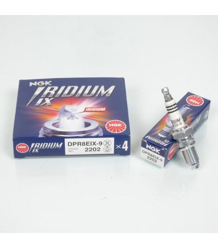 Boîte de 4 bougies d'allumage NGK DPR8EIX-9 Iridium IX neuve. Caractéristiques : - Type de bougie : Iridium IX - Type de connexion : Olive (amovible) - Culot diamètre : 12mm - Longueur filetée du culot : 19mm - Hexagonal : 18mm L'électrode est préréglée à un écartement de 0,9mm. Cette bougie est équipée d'une électrode centrale en Iridium améliorant le rendement moteur. Cette bougie est particulièrement adaptée aux moteurs quatre temps. Vendues par boîte de 4. Livrées conforme à la photo. ...