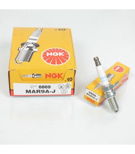 Boîte de 10 bougies d'allumage NGK MAR9A-J neuve. Caractéristiques : - Type de bougie : Standard - Utilisation : Route standard - Type de connexion : Olive fixe - Culot diamètre : 10mm - Longueur filetée du culot : 19mm - Hexagonal : 14mm Cette bougie est équipée d'une double électrode de masse et est particulièrement adaptée aux moteurs quatre temps. Vendues par boîte de 10. Livrée conforme à la photo. ...
