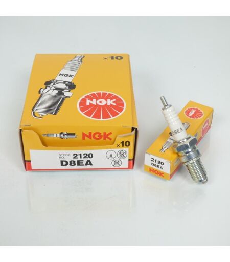 Boîte de 10 bougies d'allumage NGK D8EA neuve. Caractéristiques : - Type de bougie : Standard - Type de connexion : Embout fileté (sans olive) - Culot diamètre : 12mm - Longueur filetée du culot : 19mm - Hexagonal : 18mm Cette bougie est équipée d'une électrode design spécial améliorant le rendement moteur. Elle est particulièrement adaptée aux moteurs quatre temps. Vendue par boite de 10. Livrée conforme à la photo. ...