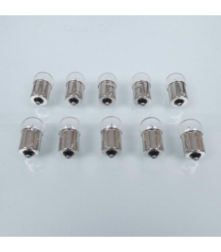 Ampoules blanches 12V 10W neuves, culot type graisseur BA15s R10W à ergots face à face non décalés. Caractéristiques : - Tension 12V. - Puissance 10W. - Ergots face à face non décalés. - Diamètre du culot métallique 15mm. - Diamètre du verre 18mm. - Longueur totale de l'ampoule 33.5mm. Vendues par 10 unités. Livrées conformes à la photo. ...