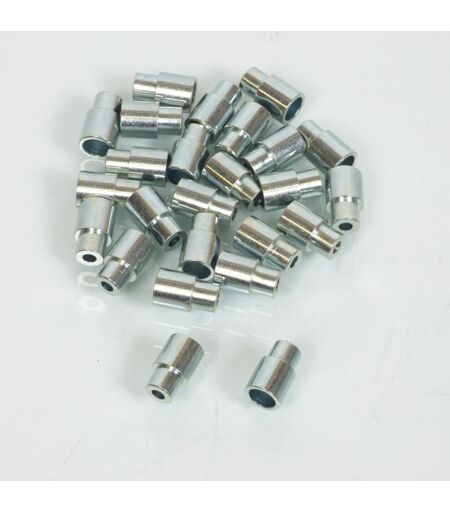 Lot de 25 arrêts butées de gaine épaulés neuf. Cet embout mesure 8mm de diamètre extérieur. Il convient pour une gaine diamètre 6.1mm maximum et un câble diamètre 3mm maximum. L'embout mesure 13mm de longueur totale. Vendu à par boite de 25 unités. Livré conforme à la photo. ...