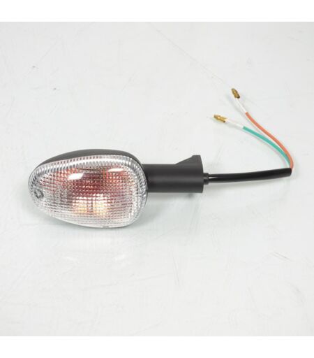Clignotant avant droit ou arrière gauche neuf de marque Vicma, homologué CE et équipé d'un cabochon transparent. Ce clignotant convient au remplacement de la pièce origine APRILIA référence : - AP8124134 - AP8127536 - AP8224197 Dimensions: - Longueur: 110mm - Hauteur: 48mm - Profondeur: 54mm - Longueur fil: 155mm - Diamètre trou de fixation: 6mm Vendu à l'unité sans ampoule. Livré conforme à la photo. ...
